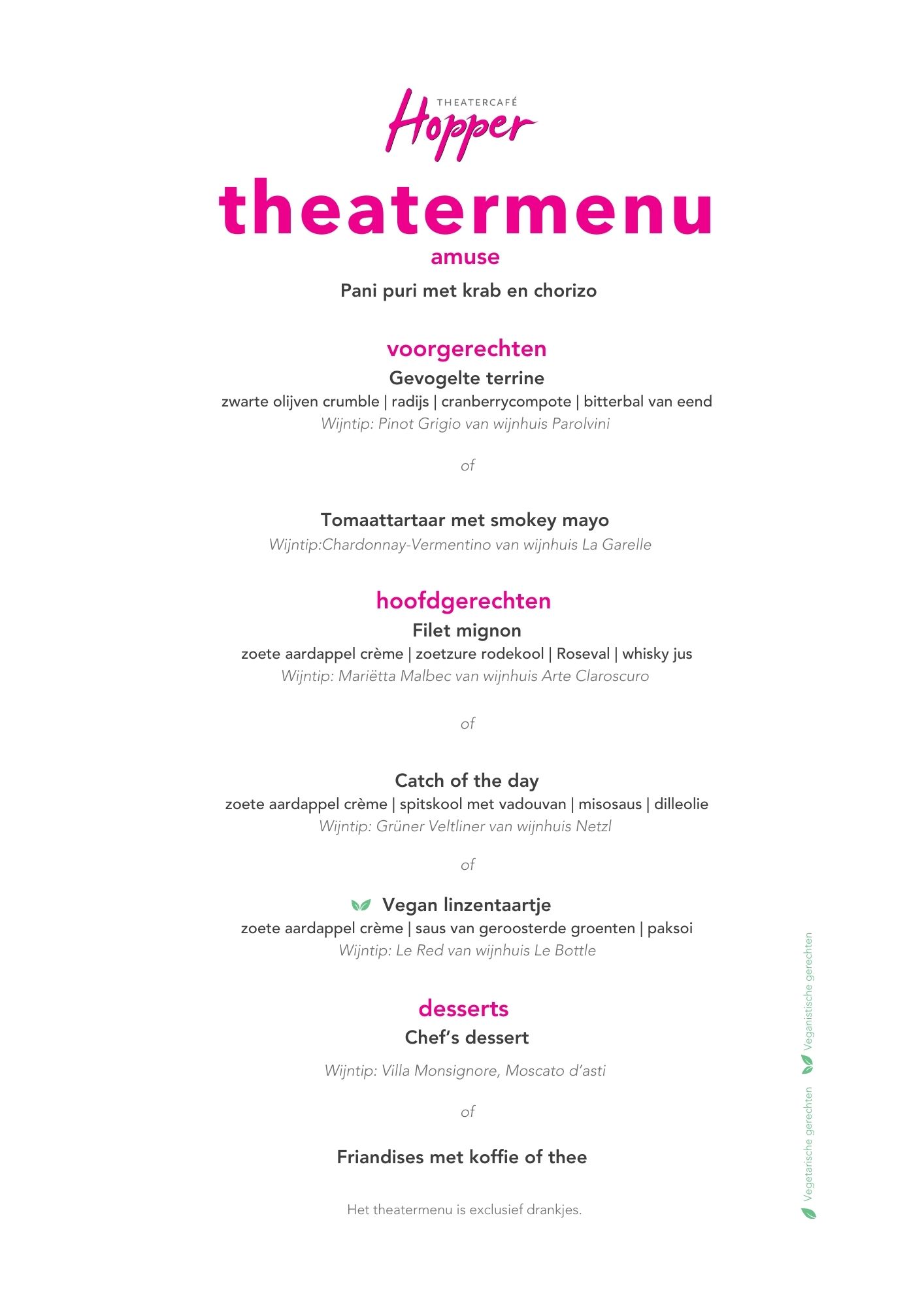 Ga je naar een voorstelling? Schuif vooraf gezellig aan voor een theatermenu. Op de kaart staat een maandelijks wisselend driegangenmenu met eerlijke, toegankelijke gerechten. Bestel een theatermenu direct online bij het boeken van een voorstelling. Bekijk hieronder het theatermenu dat nu voor je klaar staat.